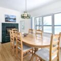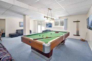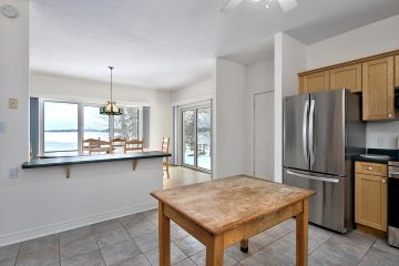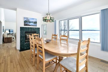 Large windows fill the home with natural light, while the living room’s vaulted ceilings and two-sided fireplace create a warm and inviting space. Sliding doors lead to a full-length deck where you can relax and take in the lake views.