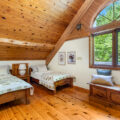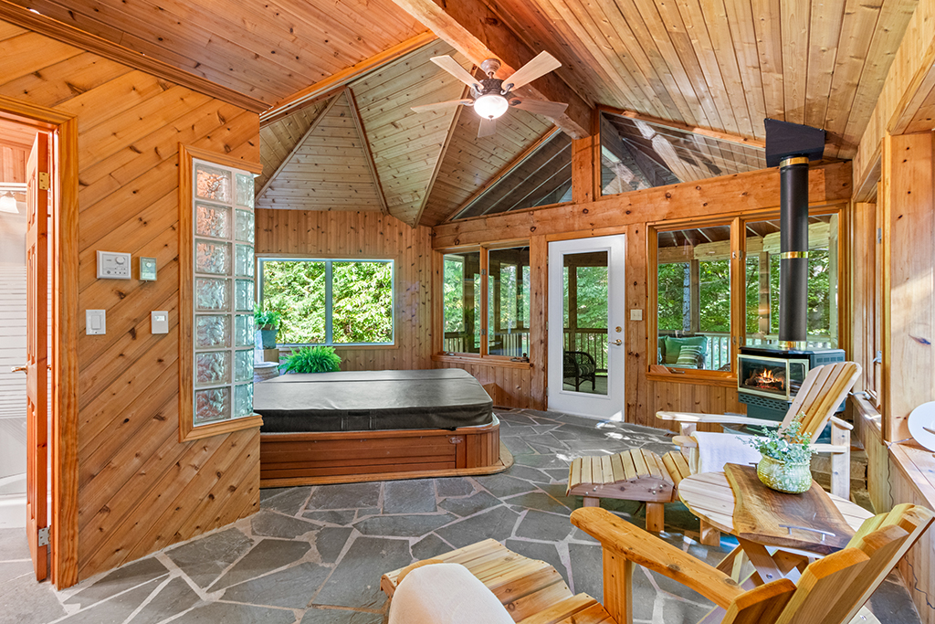 Upstairs, a charming FAMILY LOFT with its own balcony provides space for guests, games, or a cozy bunk room. After a day on the slopes, unwind in the SPA ROOM with in-floor heating, its own ventilation system, and a HOT TUB facing a propane stove. Enjoy coffee or cocktails in the SCREENED PORCH overlooking your private woodland.