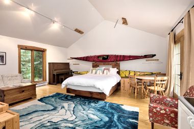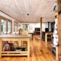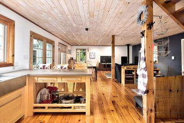 Pine floors run throughout, and a whitewashed loft provides additional sleeping space for the family. The entire house is sunlit filled with several rooms for gathering friends and family for a meal, or lively games.